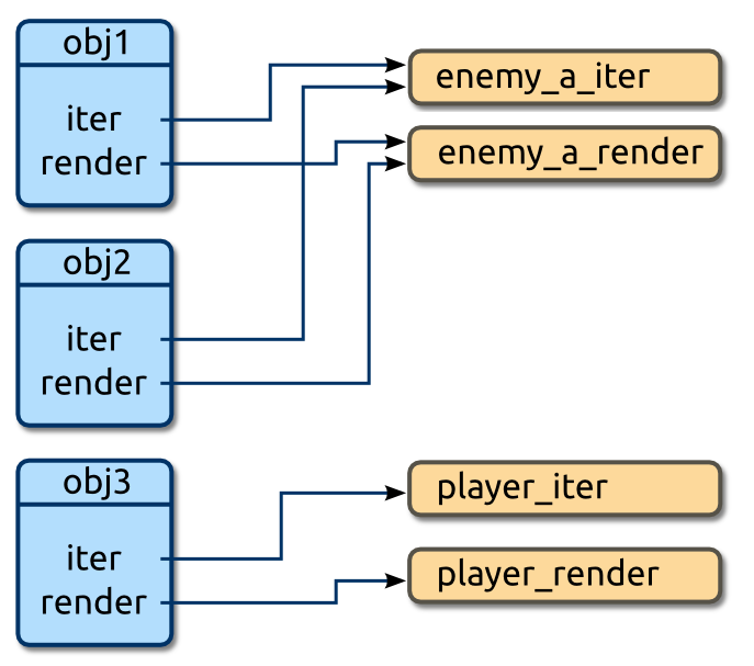 Of course we are wasting a lot of memory by storing those function pointer for each object. If this is an issue, we can use instead a single pointer to a "v-table" struct that we share among objects of the same type. But for the sake of simplicity I prefer to skip this for the moment. Also this structure offers the interesting possibility to dynamically change the methods of an active object. This can be used in game to simulate state changes. Let say your enemy has two possible states: patrolling, and attacking. If we were to use C++ it would be complicated to implement this using the language classes features. Here we could simply change the "iter" pointer of the object at any time during the game to make it behave differently: